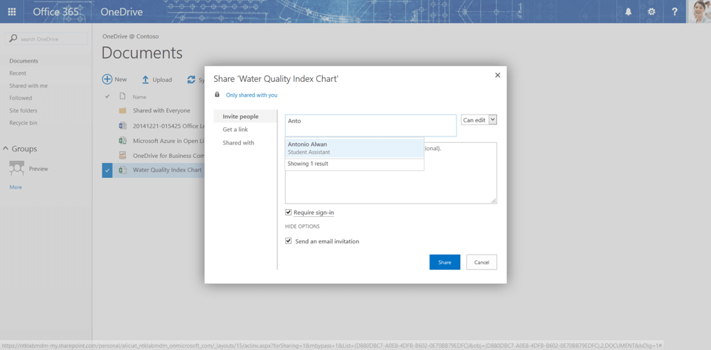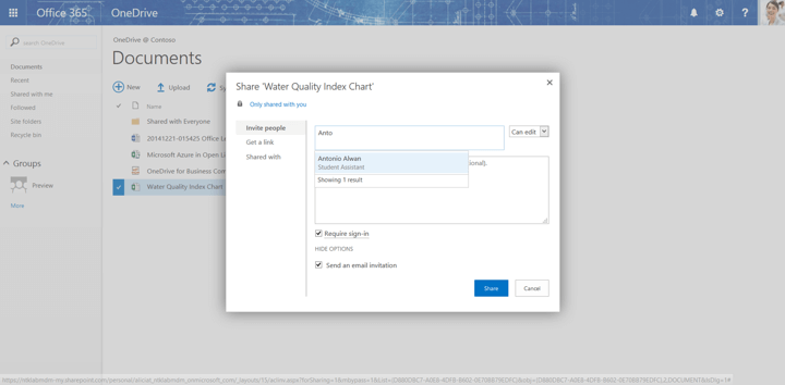 Εάν χρησιμοποιείτε το Office 365, έχετε 1 TB χώρο στο cloud για το OneDrive for Business. Όλα τα αρχεία που αποθηκεύτε στο OneDrive for Business είναι ιδιωτικά εκτός και εάν αποφασίσετε να τα μοιραστείτε. Μπορείτε πολύ εύκολα να μοιραστείτε, παραδείγματος χάριν: ένα αρχείο με όλους στον φορέα σας απλώς τοποθετώντας το στον φάκελο Shared with Everyone. Μπορείτε επίσης να μοιραστείτε αρχεία με συγκεκριμένους συνεργάτες σας ώστε να συνεργαστείτε σε διάφορα έργα.